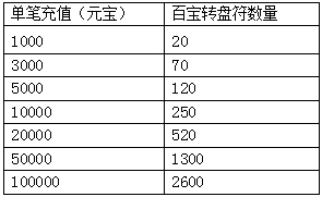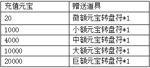 活动期间,玩家充值至指定额度,即可获得对应的元宝转盘符,使用元宝转盘符转动转盘,将可随机获得转盘上任意额度的元宝奖励。每个额度转盘只能转一次,每一轮转完之后将开启下一轮转盘。元宝转盘升级后,最高可累计获得30520非绑定元宝返利哦!