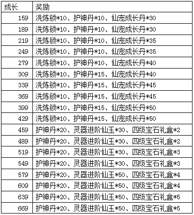 活动规则:活动期间,将仙宠提升至指定成长可获得额外奖励。