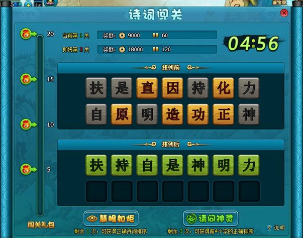 ②点击“排序前”诗词将其排列好,即为闯关成功并进入下一句诗词的闯关,过程中可使用“慧眼如炬”(只能用1次)和“请仙问灵”(只能用3次)两种锦囊;