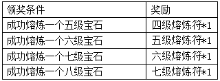 活动规则:活动期间,玩家每熔炼成功一个指定级别宝石,即可获得系统赠送的好礼一份。