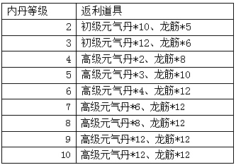活动规则:活动期间,在刷新内丹重铸系统每消费800元宝即可获得高级元气丹*3奖励!