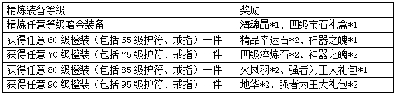 活动规则:活动期间,玩家通过橙装精炼获得任意一件橙装(包括橙色武器)或精炼成功任意暗金装备,即可获得系统奖励一份。
