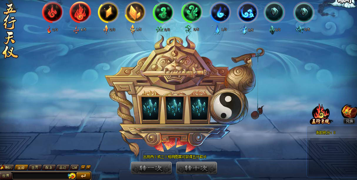1、每日可通过免费次数和元宝次数进行五行资源抽取,出现两个或三个相同图案即可获得奖励