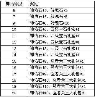 活动规则:活动期间,将任意装备神佑提升到指定等级,可获得额外系统赠礼。