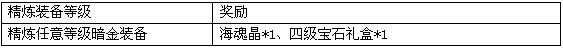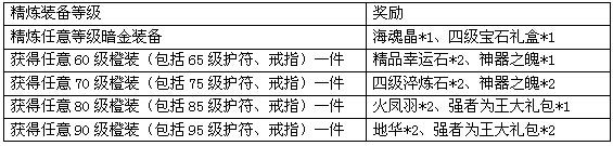 活动规则:活动期间,玩家通过橙装精炼获得任意一件橙装(包括橙色武器)或精炼成功任意暗金装备,即可获得系统奖励一份。
