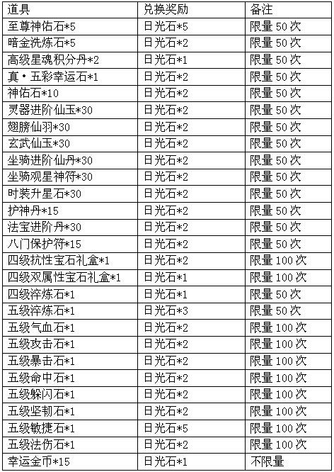 兑换列表如下: