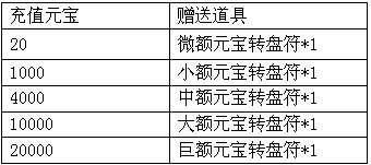 活动期间,玩家充值至指定额度,即可获得对应的元宝转盘符,使用元宝转盘符转动转盘,将可随机获得转盘上任意额度的元宝奖励。每个额度转盘只能转一次,每一轮转完之后将开启下一轮转盘。元宝转盘升级后,最高可累计获得30520非绑定元宝返利哦!