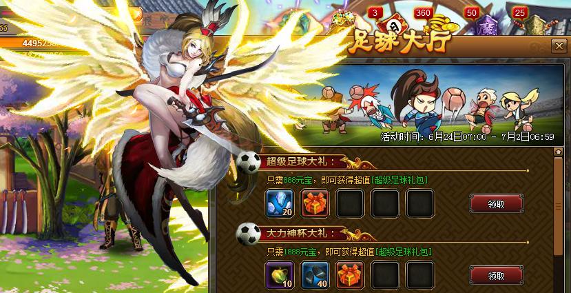 8月27日7点-9月3日7点,玩家可以在足球宝贝大厅购买高级宝石、宝石精华、神光圣水等超值道具。