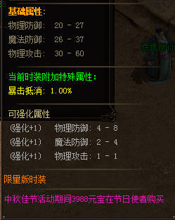 绝版时装3988元宝,特殊属性:抵抗暴击属性1%