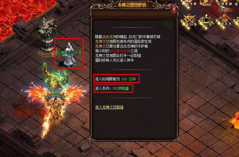 消耗500点灵魄值后等到每个小时的30-32分才能进入,不在这个3分钟的时间范围龙神之怒地图不能进入。【比如12点30-12点32分】才能进入这个地图,每次进入时限为2个小时,2个小时候将被系统传送出来。