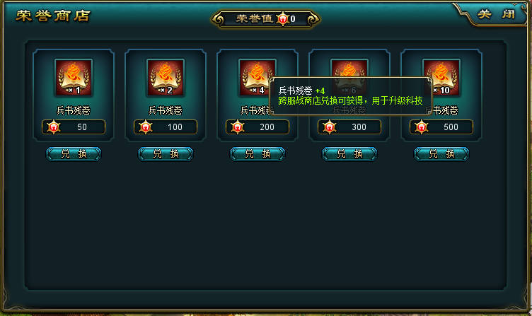 3)随着科技等级的上升,培养除了需要消耗铜钱外,还需要消耗不同等级的“兵书残卷”,该道具可通过新增的跨服战荣誉值商店进行兑换。