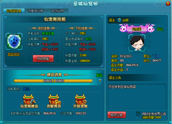 技能升级:消耗仙宠阁的贡献度升级仙宠阁技能