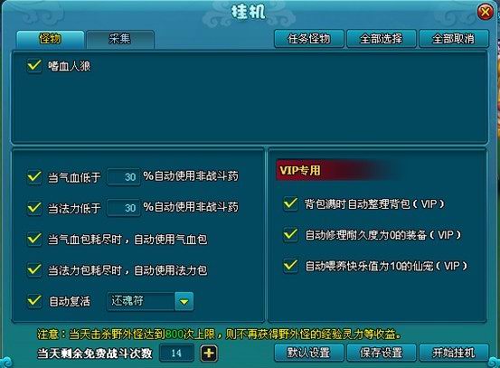 一、挂机界面 点击主界面的右上角的“挂”则可打开挂机界面 1、选择需要击杀的野外挂物,然后点击开始挂机,则可以进行挂机。 2、每天免费的战斗次数为200次 3、当次数用完后,可点击 进行购买挂机次数。 4、开通VIP会员 ①开通VIP半年卡/VIP月卡/VIP周卡后,每天可增加50/30/20次免费战斗次数。 ②开通VIP后,可以开启VIP挂机功能。比如自动修理装备、整理背包等。