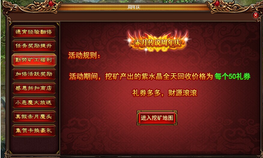 3、勤劳旷工福利,活动期间,挖矿产出的紫水晶全天价格每个50礼券