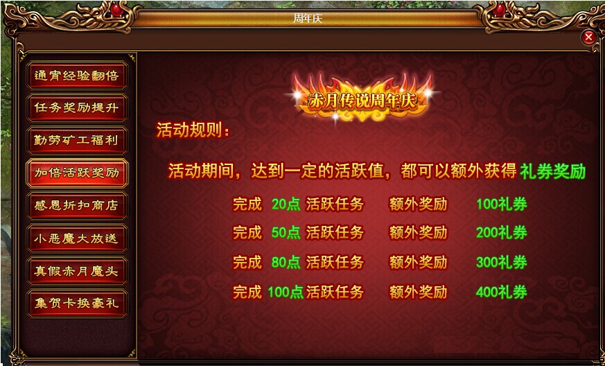 4、加倍活跃奖励、活动期间,达到一定活跃值,可额外获得礼券奖励。