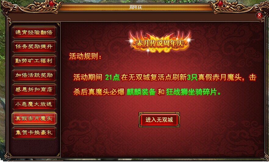 7、真假赤月恶魔,活动期间,每日21点,在无双城刷新3只赤月真假魔头,击杀真魔头,必爆麒麟装备和狂战狮碎片。