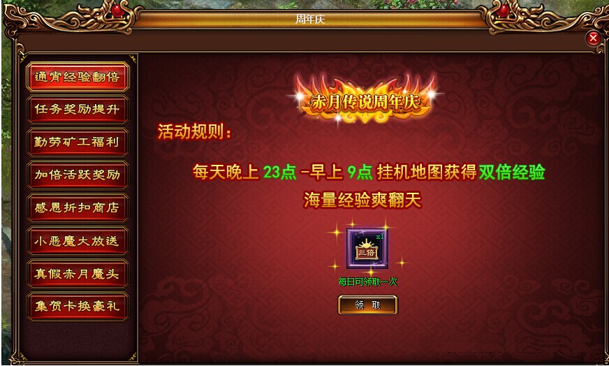 1、通宵经验翻倍,每日可领取一张3倍经验卡。