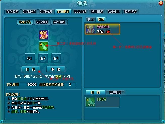 装备打孔主要是通过打孔符在装备上打孔,打过孔的装备才可以镶嵌宝石。