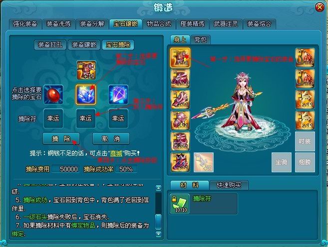 宝石摘除主要用于摘除已镶嵌在装备上的宝石。