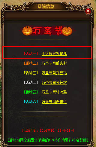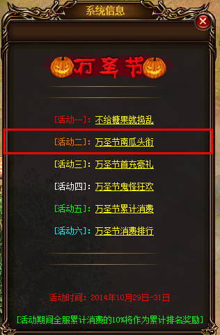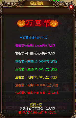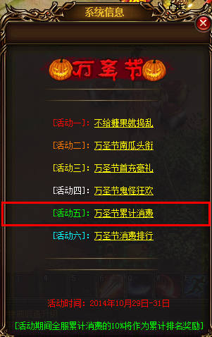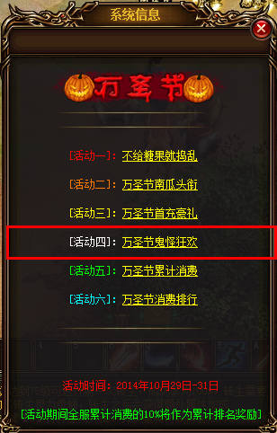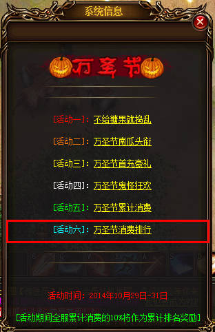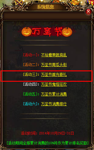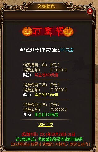 活动规则:万圣节活动期间,全服累计消费的10%的元宝,将存放在活动奖池内。活动结束时,按消费排行,奖励第一名奖池60%元宝,奖励第二名奖池30%元宝,奖励第三名奖池10%元宝。