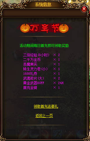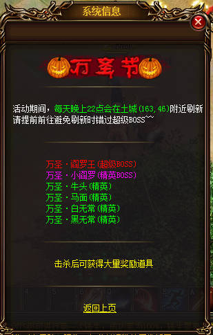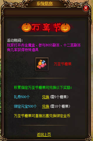 活动内容:万圣节期间,玩家打开赤金魔盒,参与BOSS副本,十二宫副本,打怪有几率获得万圣节糖果。