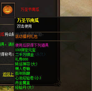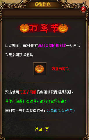 活动规则:活动期间,没3小时在赤月皇城随机刷出一批南瓜,采集后可获得南瓜礼包。