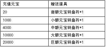 活动期间,玩家充值至指定额度,即可获得对应的元宝转盘符,使用元宝转盘符转动转盘,将可随机获得转盘上任意额度的元宝奖励。每个额度转盘只能转一次,每一轮转完之后将开启下一轮转盘。元宝转盘升级后,最高可累计获得30520非绑定元宝返利哦!