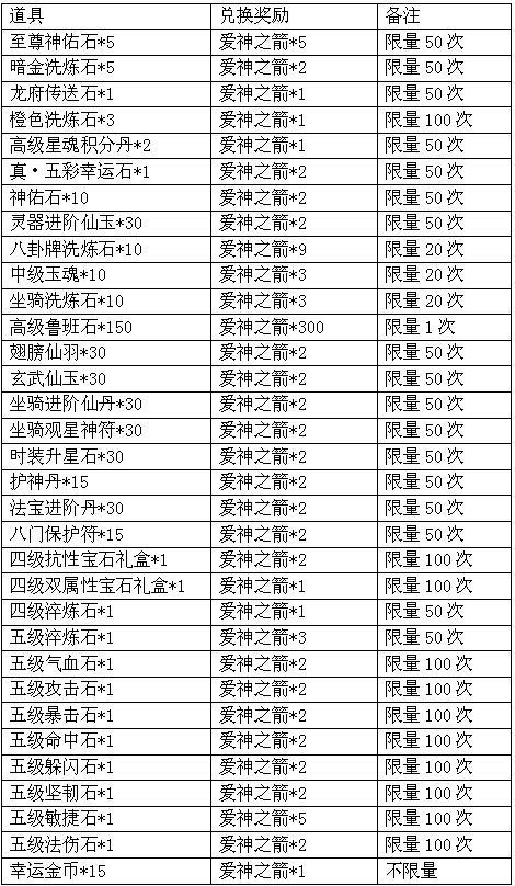 兑换列表如下: