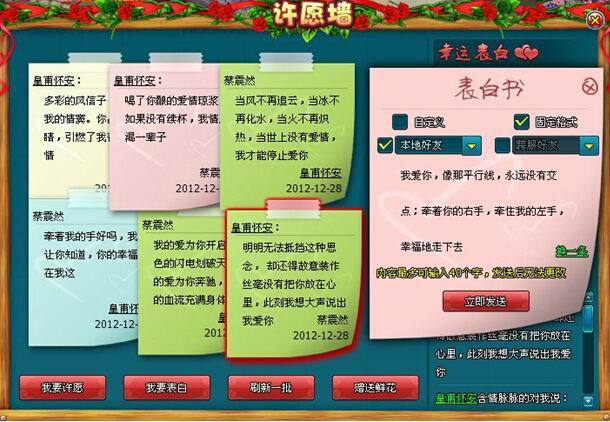 ② 玩家还可以在许愿墙上查看其他玩家写下的表白和愿望,假若被某条表白感动,你还可以向该表白者送花表示祝福。