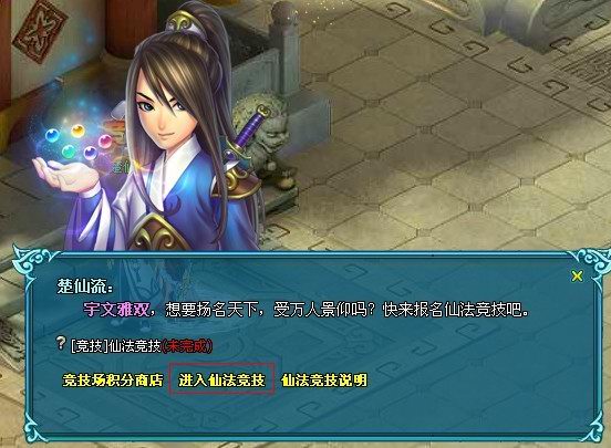 玩家入场:玩家报名后传送入竞技场准备区,比赛开始前不得PK,中途可找场内NPC竞技场管理员退出场景,视为退出报名,不可获得积分。进入正式场景后,系统将玩家分配到离火组,或玄水组。
