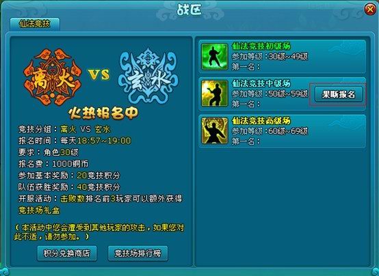 1.所有30级以上的玩家在每天的18:57~19:00可报名参加竞技场战斗。