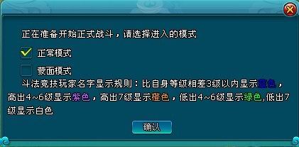 1.玩家进入竞技场可以选择模式:1.正常模式(按照玩家原来的形象进入,在准备区域玩家可以查看您的信息) 2.蒙面模式(穿戴蒙面服装,让其他玩家无法知悉您的信息)如下图: