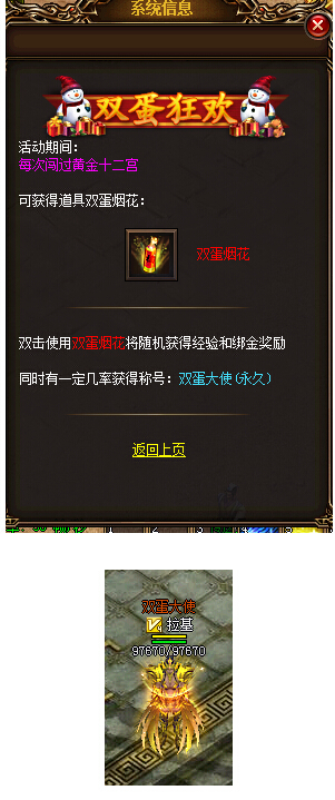 双蛋烟花使用可随机获得经验和绑金奖励 还有一定几率获得称号:双蛋大使(永久)