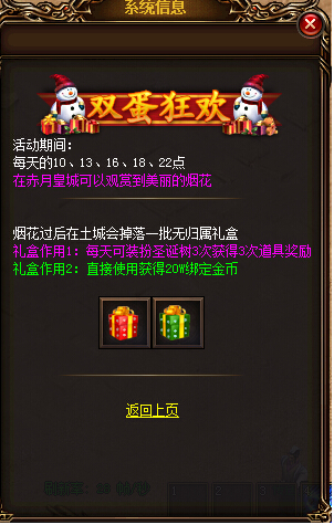 参与方式:玩家可打开右上角【双蛋狂欢】图标,或者在赤月皇城148,89【节日使者】处查看活动内容