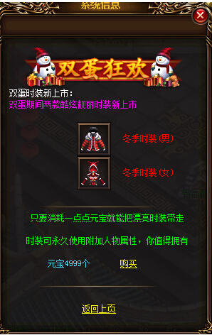 【活动内容】活动期间,花4999元宝可以购买绝版冬季时装