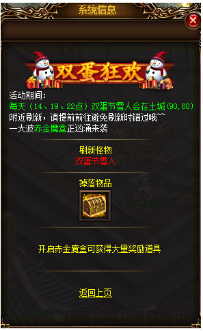 【活动内容】活动期间,在特定时间在土城会刷新出双蛋雪人,击杀可获得赤金魔盒