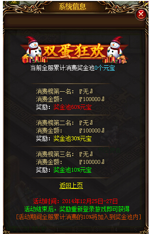 【活动内容】在12月25日-27日消费前三,即可获得奖金池中的元宝。