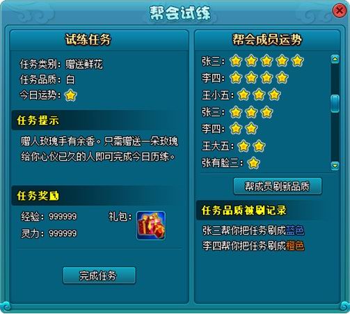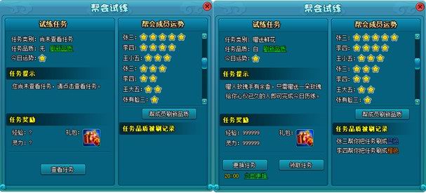 查看任务后,如果对任务品质不满意,玩家可点击任务品质旁边的“刷新品质”按钮,向帮会其他成员求助。其他帮会成员帮主刷新后,玩家的任务品质会发生改变,运势越好的玩家帮刷出高品质任务的几率越高。任务品质被刷新后,帮会试炼面板上会有任务品质被刷记录。