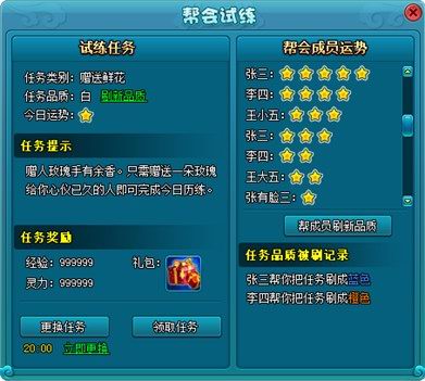 40级以上的玩家每天都可到帮会领地内的帮会管理员处领取帮会试炼任务,完成帮会试炼任务可获得种类丰富的奖励。该任务每天可接1次,玩家可自己更换任务完成条件。同时玩家还可像帮会其他成员求助刷新任务品质,从而获得更高的奖励。(如图所示)