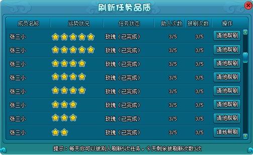 每个玩家每天都有5次帮助他人刷新任务的机会,当日的运势越好帮助别人刷出高品质任务的几率就越高。所以运气好的人是非常受欢迎的哦,如果有人请求你帮他刷新任务,你的主界面中央会出现一个图标,点击后可选择是否进入刷新面板帮助他刷新任务品质。当然,即使你没有收到别人的刷新请求你也可以通过帮会历练面板的按钮主动帮他人刷新任务品质。不过运势不好的时候就不要去帮别人刷啦。