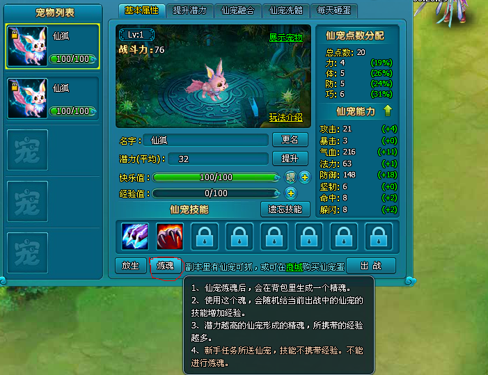 ①在仙宠主界面上,有“炼魂”的按钮。鼠标移动过去,会有TIPS说明相关的功能。