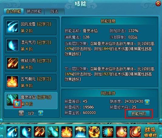 技能每次升阶都有特定熟练度要求,如果当前该级别熟练度达不到升级需求,则该技能无法升阶。