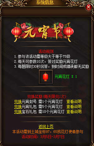 【活动内容】活动期间,土城新增NPC—花灯使者,等级大于75级玩家每天可到NPC处进行猜灯谜活动,每天可猜10次,每次限定30秒内给出答案,错误不给予奖励,答对奖励元宵花灯