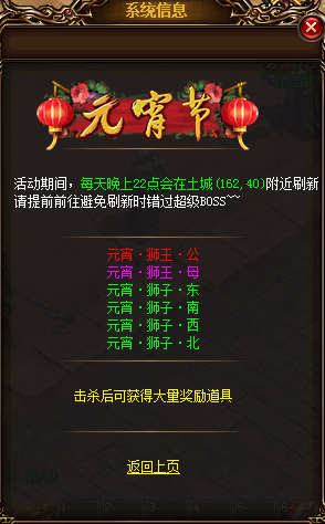 【活动内容】活动期间,每天晚上22点土城会进行舞狮活动,击杀会掉落道具奖励;