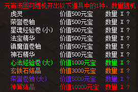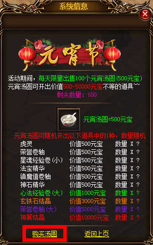 【活动内容】活动期间,每天限量出售100个元宵汤圆(500元宝购买一个),元宵汤圆可随机开出价值500-50000元宝的道具