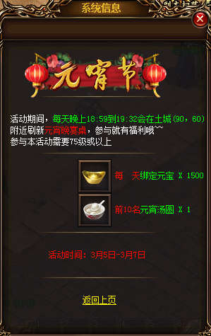 【活动内容】活动期间,每天的19:00-19:30在土城会开启元宵晚宴,75级以上玩家可免费参与晚宴,可获得1500绑定元宝;前十名采集的额外奖励每次1个元宵汤圆