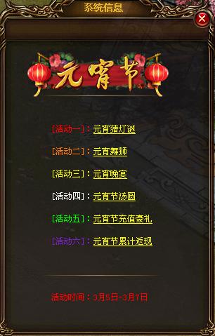 元宵节来了,在今年的3月5日至3月7日的三天里,360uu《赤月传说》自然不会袖手旁观,玩家在游戏界面的右上角点击节日狂欢图标或者在赤月皇城的节日使者处对话便能参与到活动内容中来了。今年的元宵节,我们也为玩家准备了六重大礼,从跟随元宵节传统的四个传统活动,到两个回馈玩家支持的充值豪礼,相信一定不会让玩家们失望,下面就赶紧登陆游戏见证元宵节的最后狂欢吧。