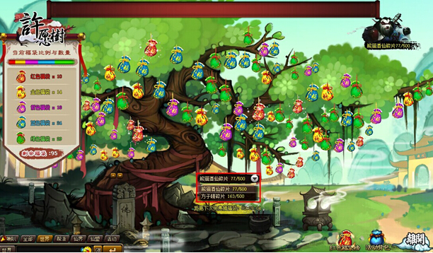 本次许愿树新增伙伴碎片自选功能,将同时开放轩辕黄帝、西门小吹、熊猫酒仙、斗战胜佛、方子晴碎片,玩家可根据自己的需要选择想要获得的伙伴碎片