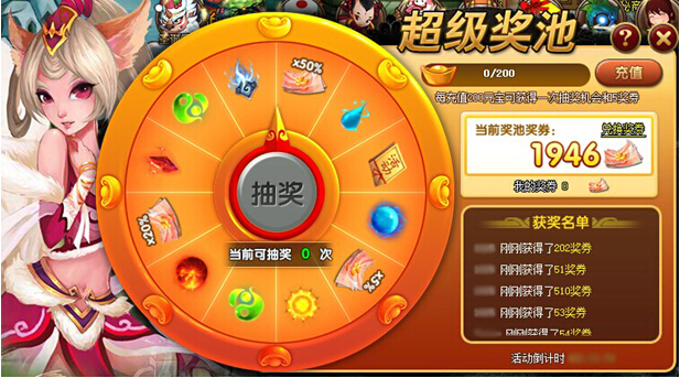 1、活动期间,每次累计充值200元宝即可进行1次抽奖,并可额外获得5奖券