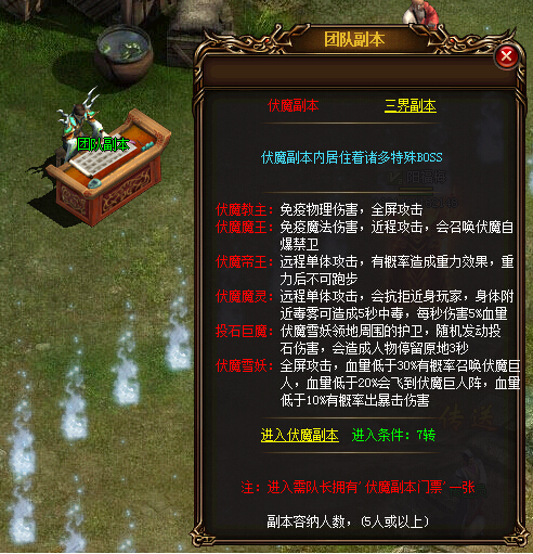 玩家达到7转以上,队长需要拥有伏魔副本门票(火龙王几率爆出)一张,副本需要5人以上才能进去。